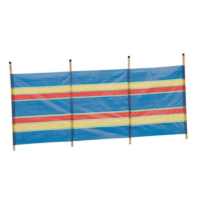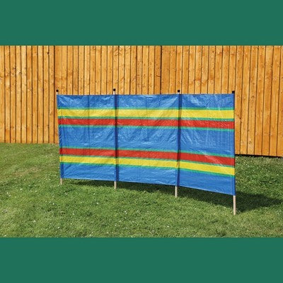 Excellent value multi-coloured polythene windbreak with wooden poles. Keeps the wind at bay and is highly visible so it's easier to see from a distance.